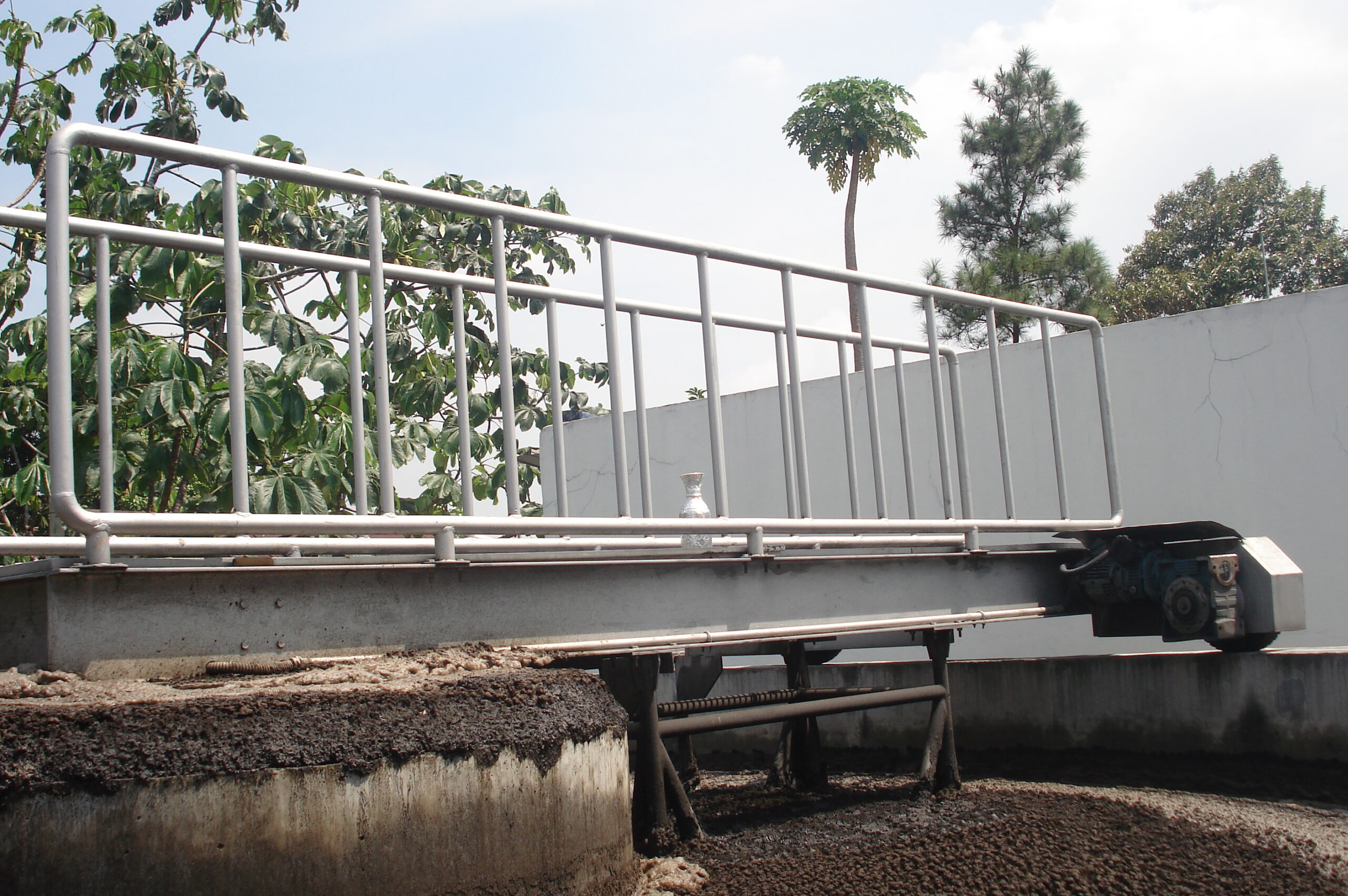 Tantangan utama yang dianalisis dalam survei ini adalah kebutuhan untuk meningkatkan efisiensi proses pemisahan padatan-cairan di dalam sebuah tangki clarifier sirkular pada sebuah fasilitas pengolahan air limbah. Berdasarkan dokumentasi visual, tangki tersebut menunjukkan kondisi operasional dengan beban padatan yang tinggi, terlihat dari adanya lapisan lumpur (sludge) yang tebal dan berwarna gelap di permukaan. Kondisi ini mengindikasikan bahwa sistem bekerja pada atau bahkan melebihi kapasitas desainnya. Tantangan ini sering dihadapi oleh IPAL yang mengalami peningkatan debit air limbah seiring dengan pertumbuhan produksi atau populasi yang dilayani.