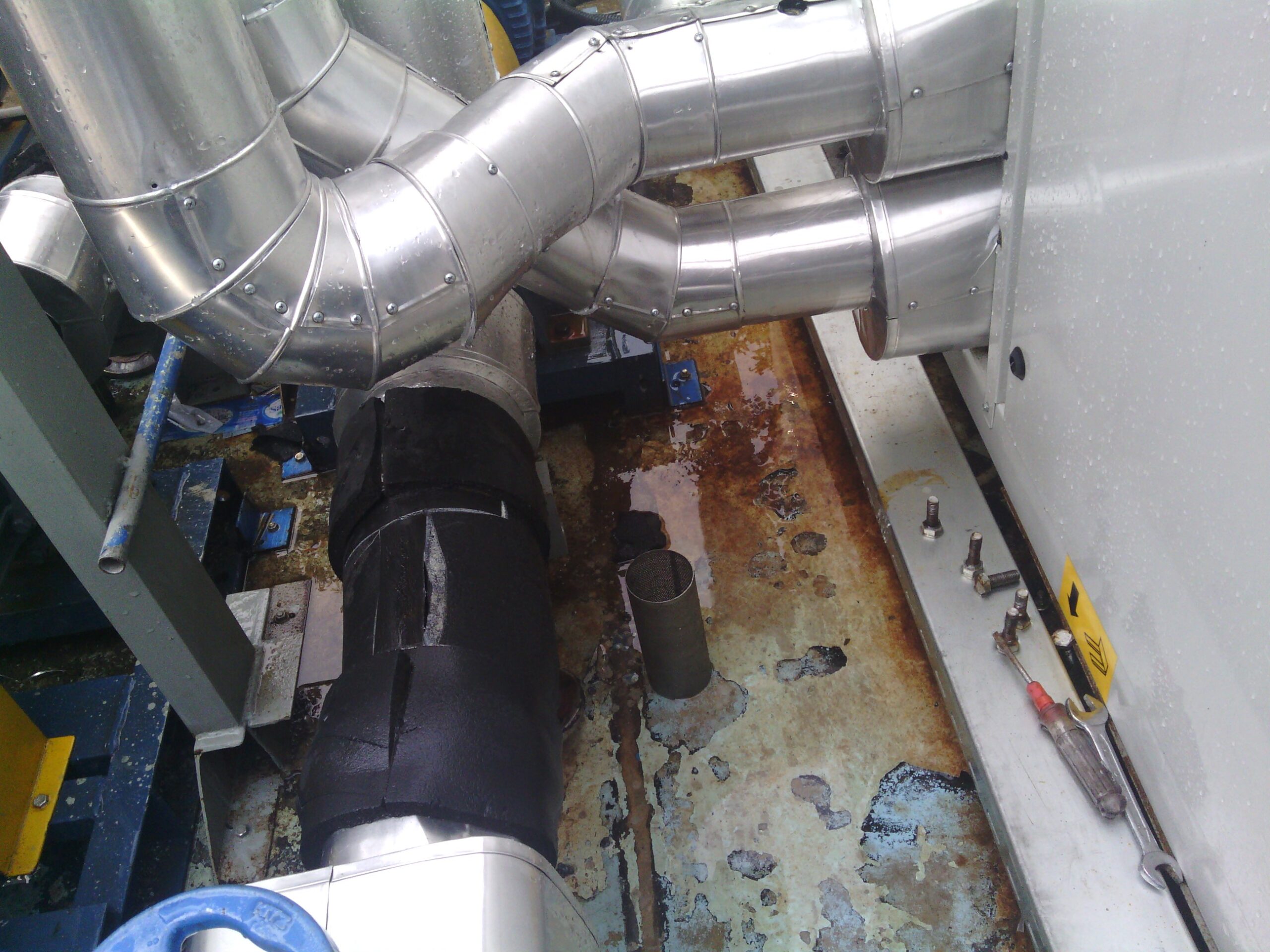 Pekerjaan mencakup pembongkaran selektif pada area-area yang dicurigai mengalami kebocoran atau penyumbatan. Indikator visual awal menunjukkan adanya rembesan air di lantai beton di bawah unit heat exchanger, yang mengindikasikan bahwa fluida kerja telah menembus lapisan insulasi. Tugas kami meliputi isolasi jalur pipa (valving off), pengurasan segmen yang terdampak, pembukaan jacket cladding, inspeksi visual kondisi pipa baja karbon di dalamnya, serta pemeriksaan komponen penyaring (strainer) yang sering menjadi tersangka utama dalam kasus penurunan laju aliran (flow rate).